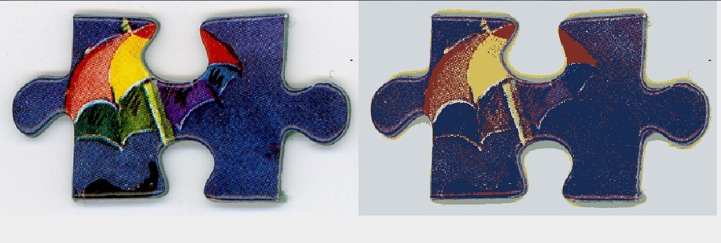 The first stage of this process is acquiring the physical pieces in some manner. Others previously had photographed each piece individually with controlled lighting, photocopied and then scanned the pieces, and even hand-traced the piece outlines. I made some attempts at photography, but the noise generated by the consumer- and mid-range cameras available (and, in particular, their use of jpeg) made them hard to work with at the pixel level. Instead I fired up my aging scanner, arranged the puzzle pieces face down and took a few scans at various DPI’s. The ideal I arrived at was 300 DPI, and the images were clear and well defined, although problems were created, which we’ll discuss in a moment.