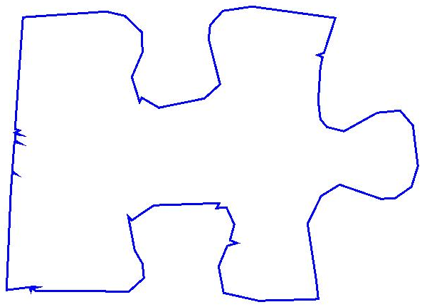 Now the real meat of the problem can begin: Solving! My implementation is based to that of Wolfson et al in “Solving jigsaw puzzles by computer”, with the aim to produce a rotation and scale invariant “signature” for a series of line segments, based on the change of angle between each of them. The final output is something like below…