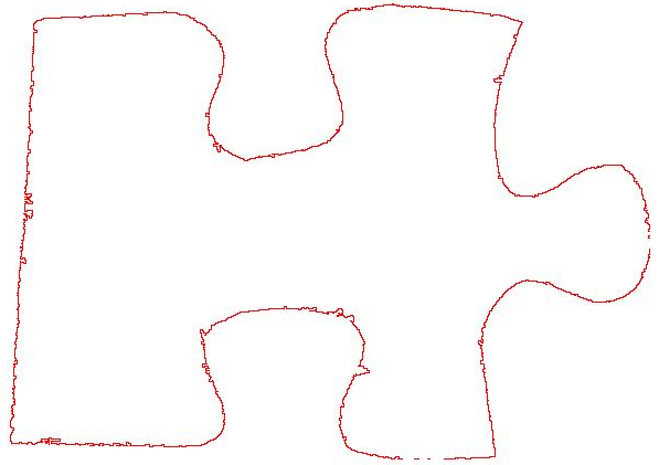 Extracting the piece outline is simple in theory, but the implementation took a lot of debugging. This section of the program was based on Potrace, which aims to vectorise low quality bitmap images by tracing the shape edges and applying a smoothing algorithm to remove the bitmap imperfections. My edge tracing implementation was based exclusively on the Potrace paper, and developed with small 20×20 images until it was stable, as below.